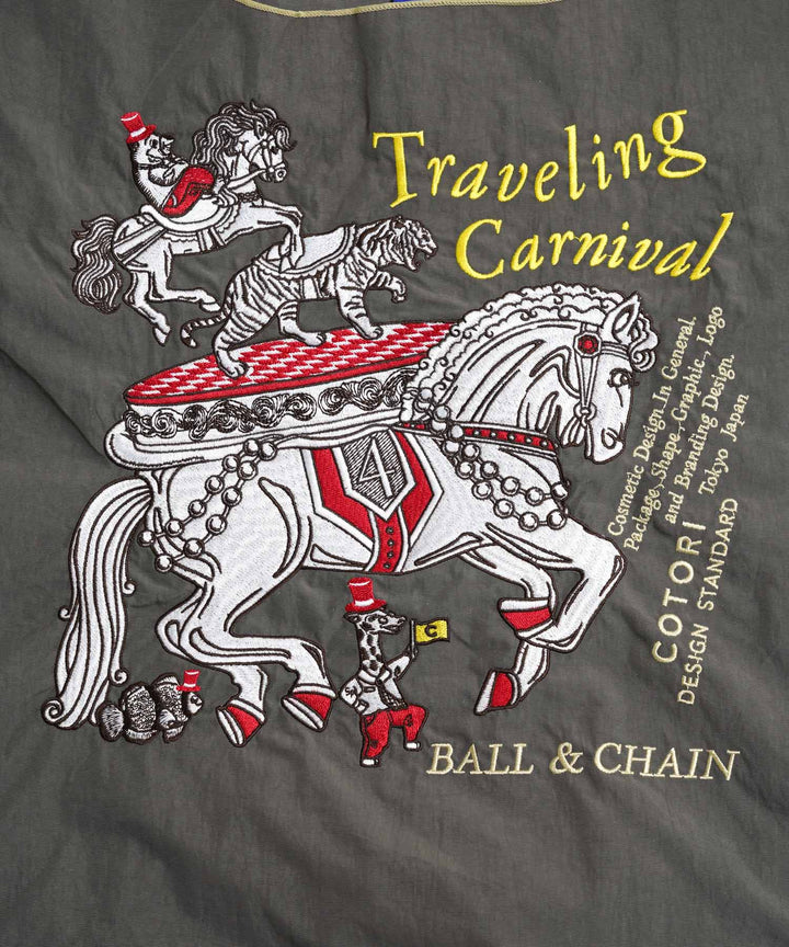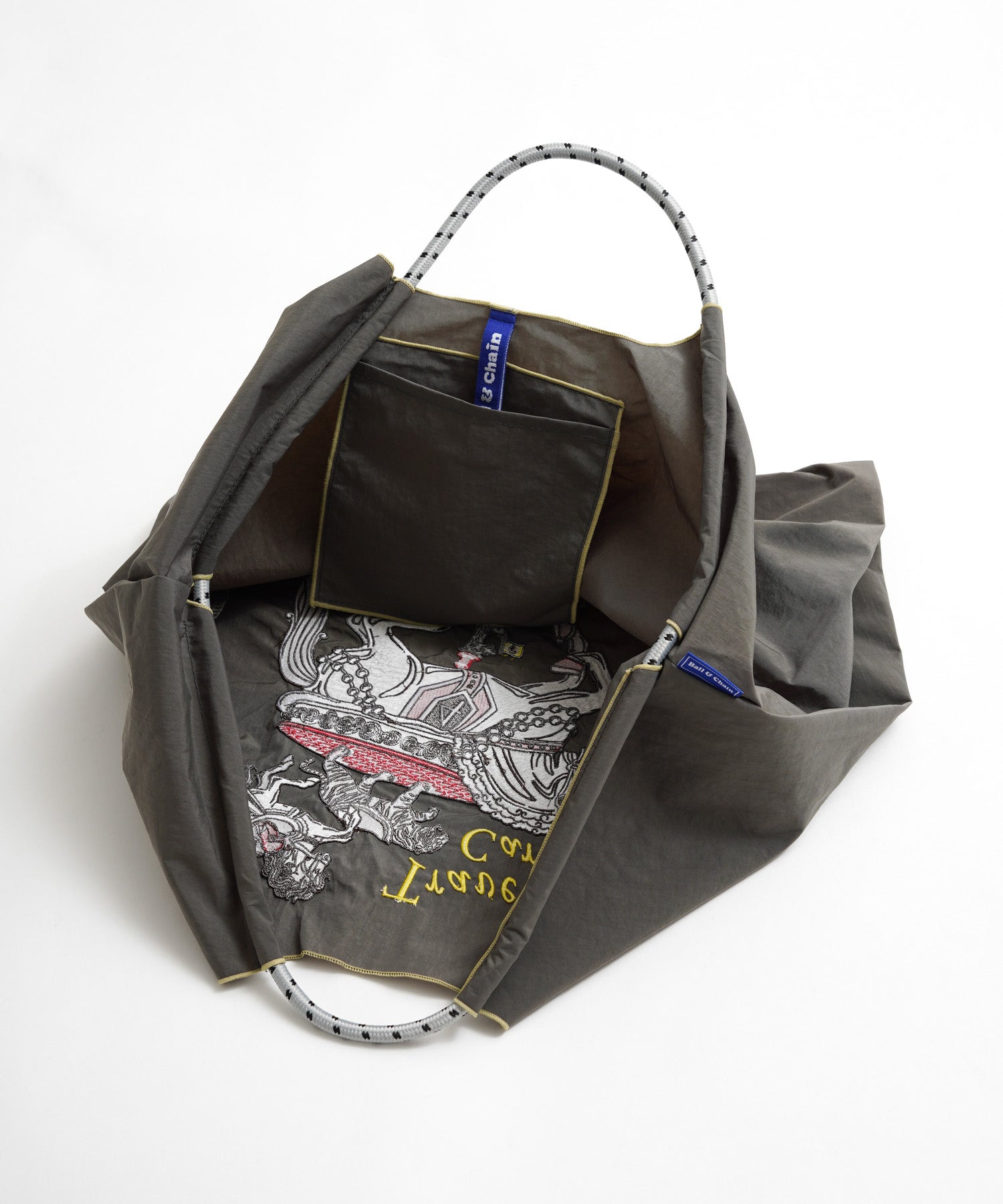 Ball and Chainは大切に使い続けたいと思える優れた デザインのショッピングバッグです。 耐久性、撥水性に優れた厚手のポリエステル素材に、 グラフィックデザインをそのまま「刺繍」で施すことで、 高級感がありデザイン性の高いバッグとなっています。 丸く折りたたみ付属のゴムバンドでとめると手のひらほどの コンパクトサイズになるため、持ち運びにも便利です。 普段のお買い物はもちろん、エコなプレゼントとしてもおススメです。